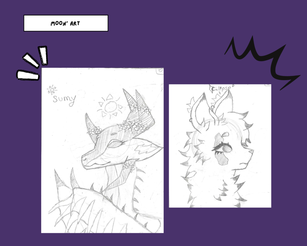 Voilà ! Sumy le dragon et Calipso le félin fantastique. J’ai mis les noms en gros au-dessus de chaque dessin, avec un encadré façon « titre » manga. J’ai aussi ajouté des bulles de texte et ces éclats d’énergie autour de leurs visages pour les dynamiser.