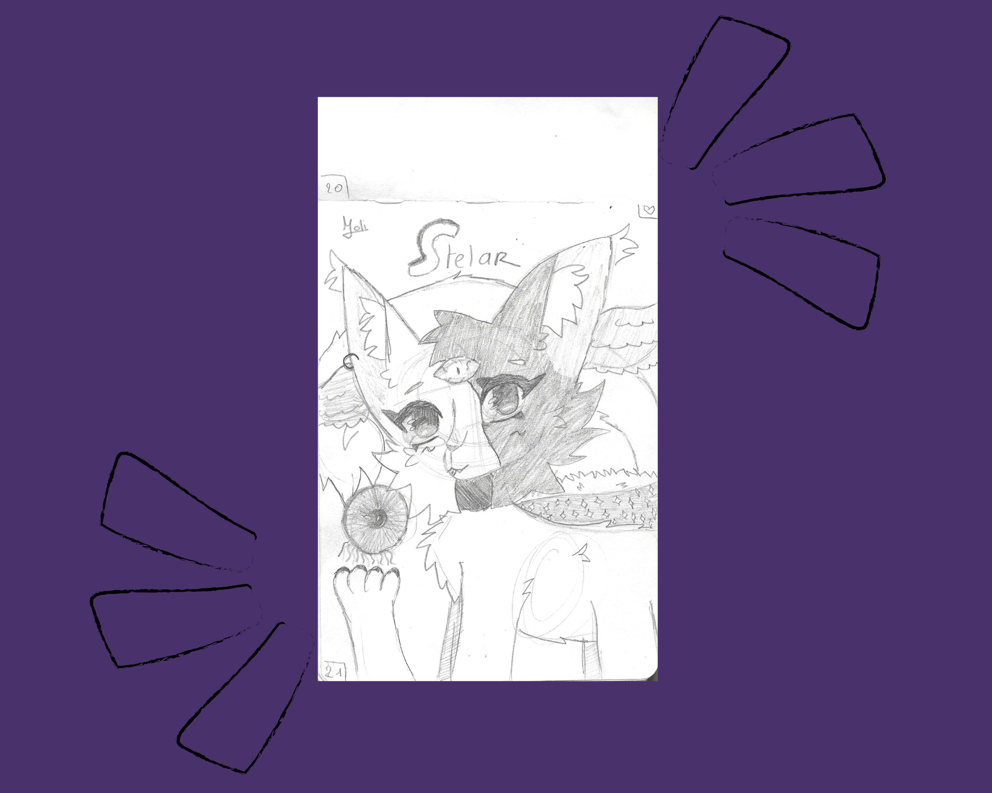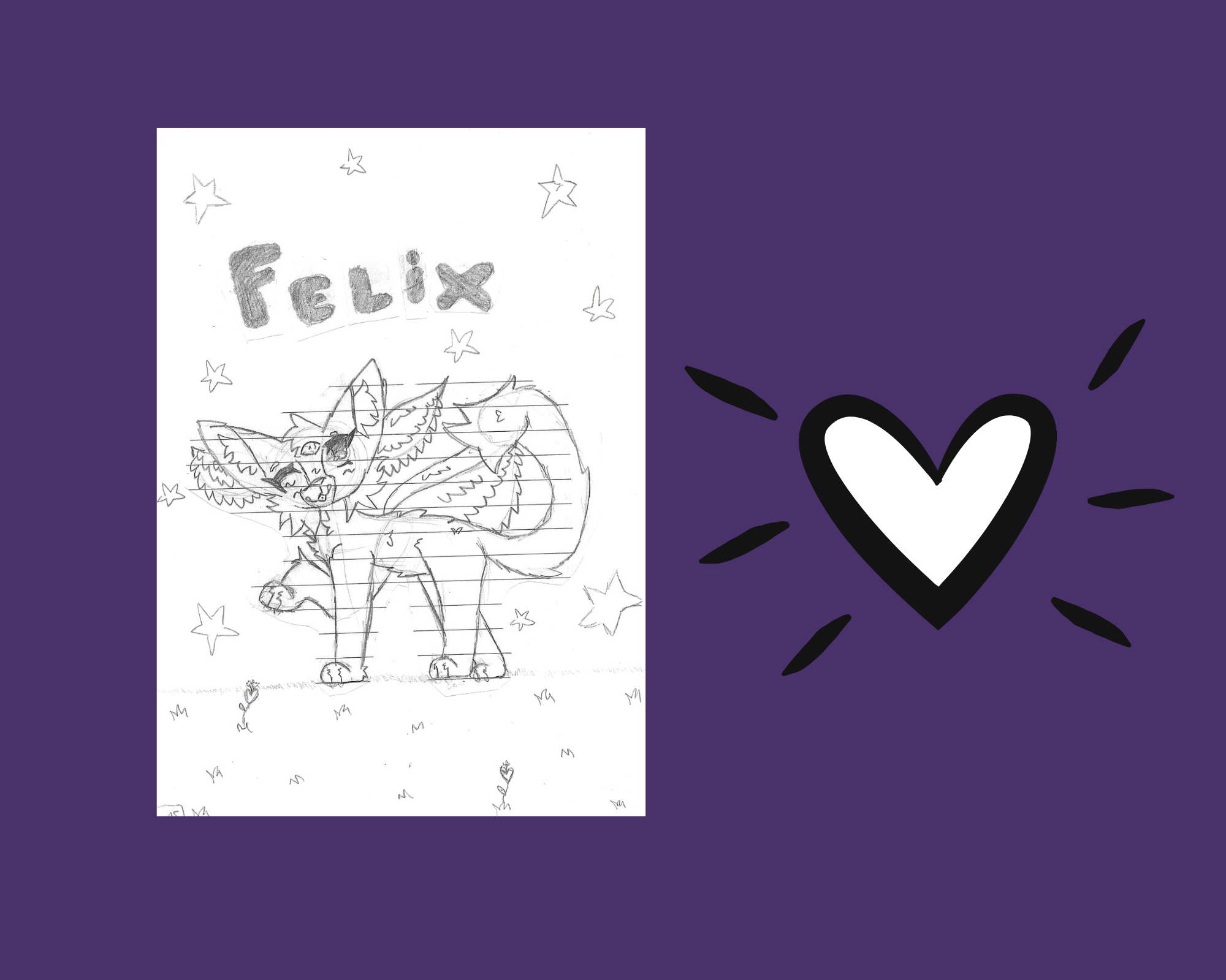 Felix (ce petit loup/chien ailé) est le premier personnage auquel j'ai donné un nom et une identité. Vous pouvez voir que j'ai fait l'effort de le dessiner entièrement, avec des herbes et des étoiles tout autour pour le situer dans un monde.